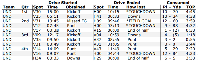 - Take a look at the drive chart for UND. Started out unbelievably well but completely stalled out for 1.5 quarters.